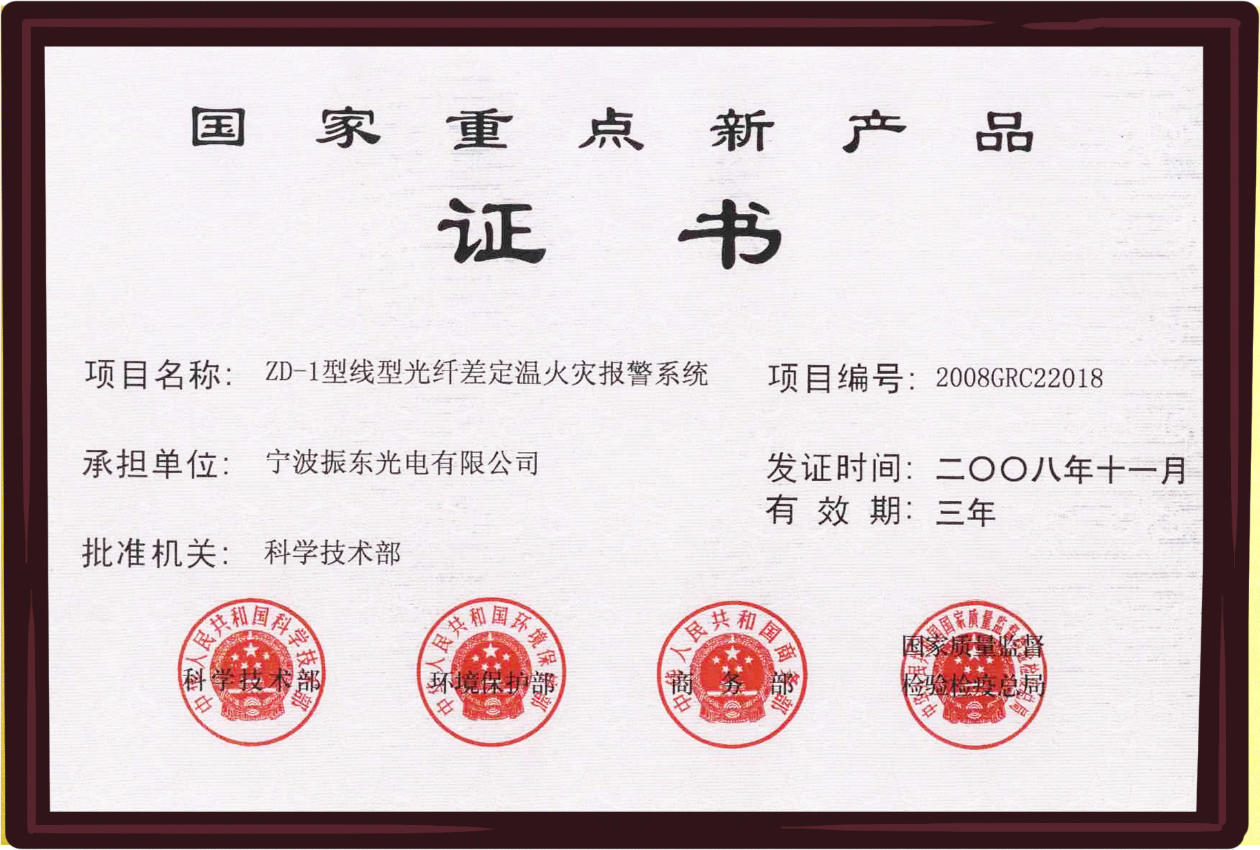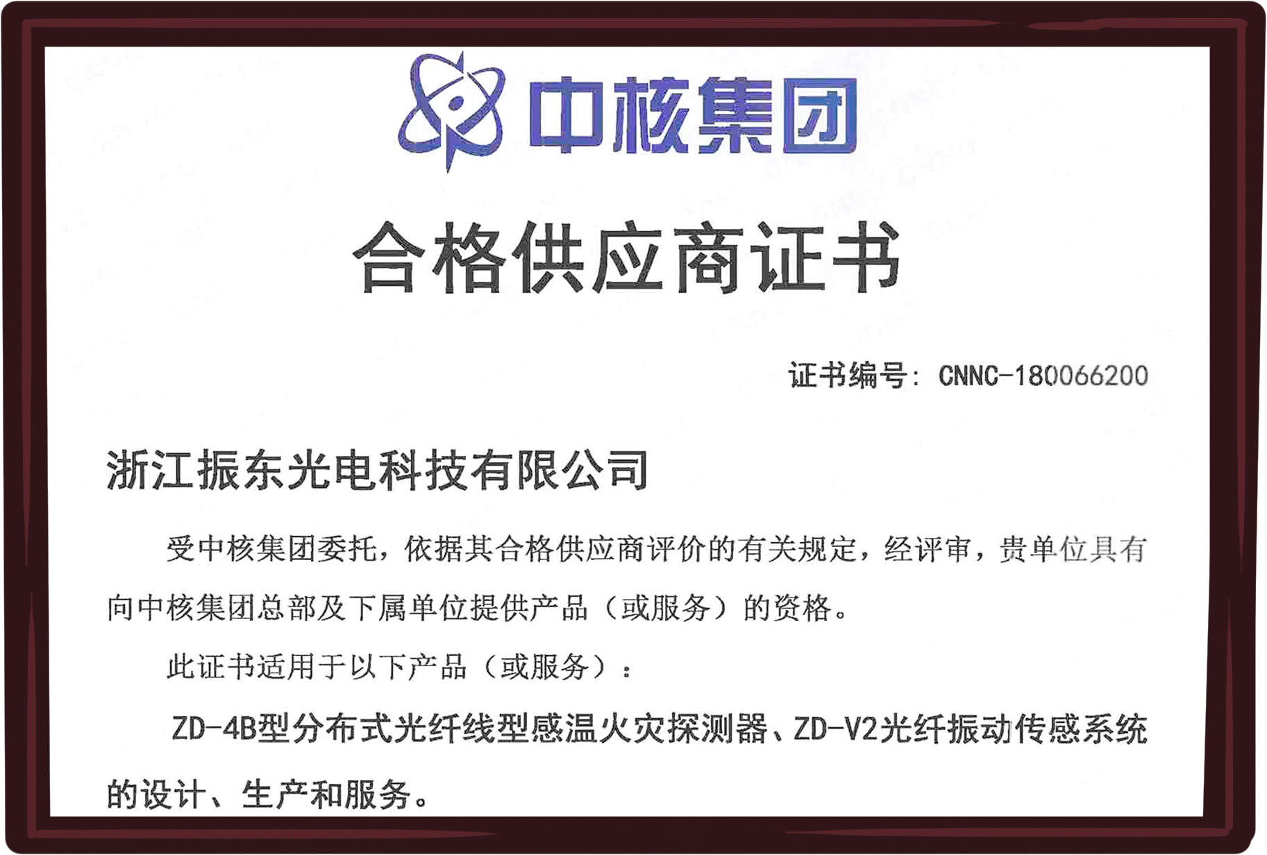 公司“振東”品牌“ZD系列”光纖傳感系統(tǒng)產(chǎn)品已通過國家消防電子產(chǎn)品質(zhì)量監(jiān)督檢測中心和 國家安全防范報警系統(tǒng)產(chǎn)品質(zhì)量監(jiān)督檢驗中心檢驗,并已獲得應(yīng)急管理部消防產(chǎn)品合格評定中心CCCF認(rèn)證證書。同時,產(chǎn)品已納入中核集團合格供應(yīng)商體系、中廣核商務(wù)平臺和海灣安全技術(shù)有限公司合格供應(yīng)商體系。